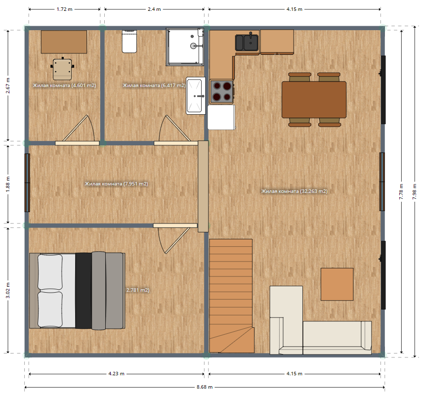 Для каркаса используется только сухая калиброванная доска. Она не гниет и не меняет свою геометрию в процессе эксплуатации дома.